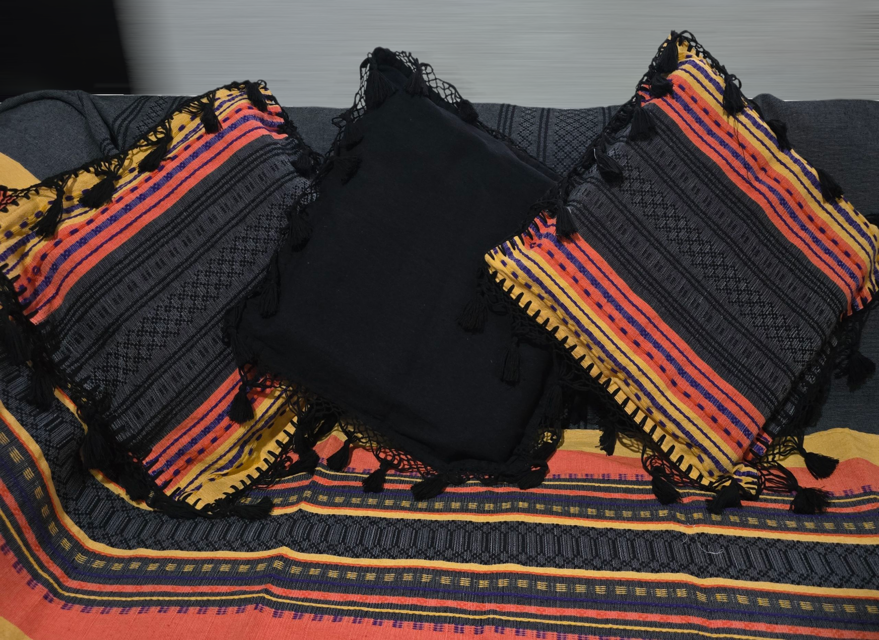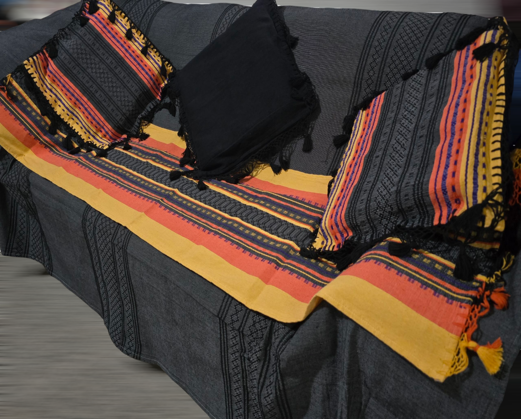 Este exclusivo conjunto de textiles tejidos a mano es perfecto para añadir un toque de elegancia espeluznante a tu hogar este Halloween. Con un diseño llamativo en una cálida paleta otoñal de naranja intenso, amarillo dorado y negro intenso, esta colección es a la vez festiva y elegante. Las tres fundas de almohada a juego y el versátil camino de mesa están elaborados con una técnica de tejido tradicional. Los patrones incluyen intrincados motivos geométricos y rayas llamativas, creando un aspecto dinámico. Cada pieza está rematada con alegres borlas negras, que le aportan un toque encantador y bohemio.